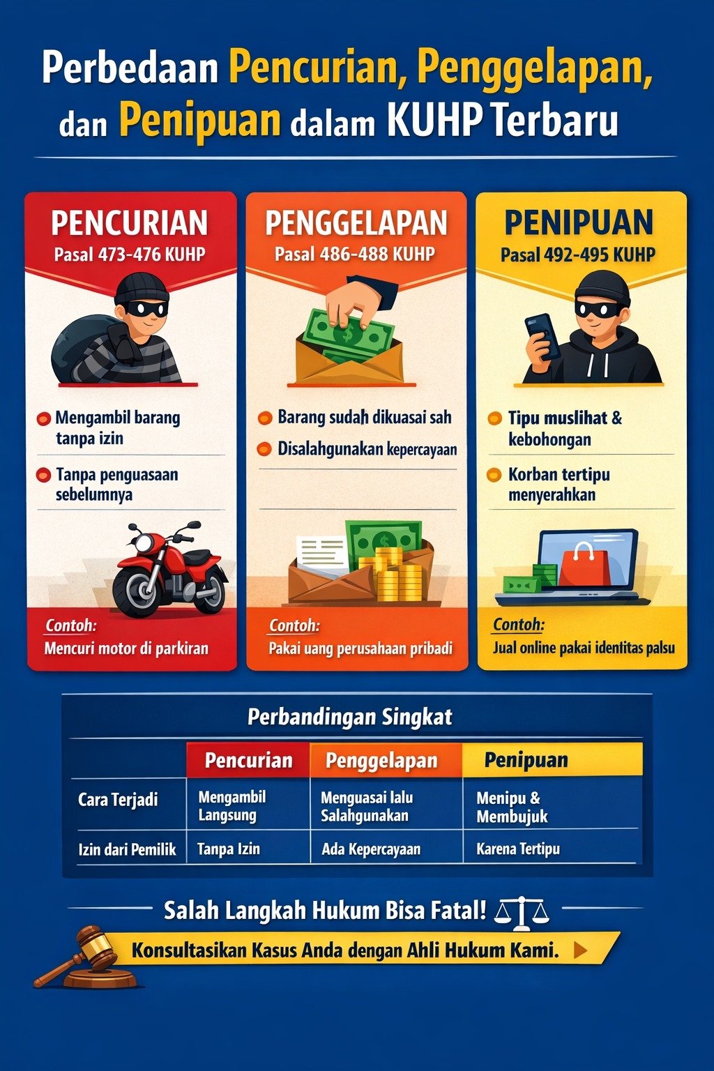 Perbedaan Pencurian, Penggelapan, dan Penipuan dalam KUHP Terbaru